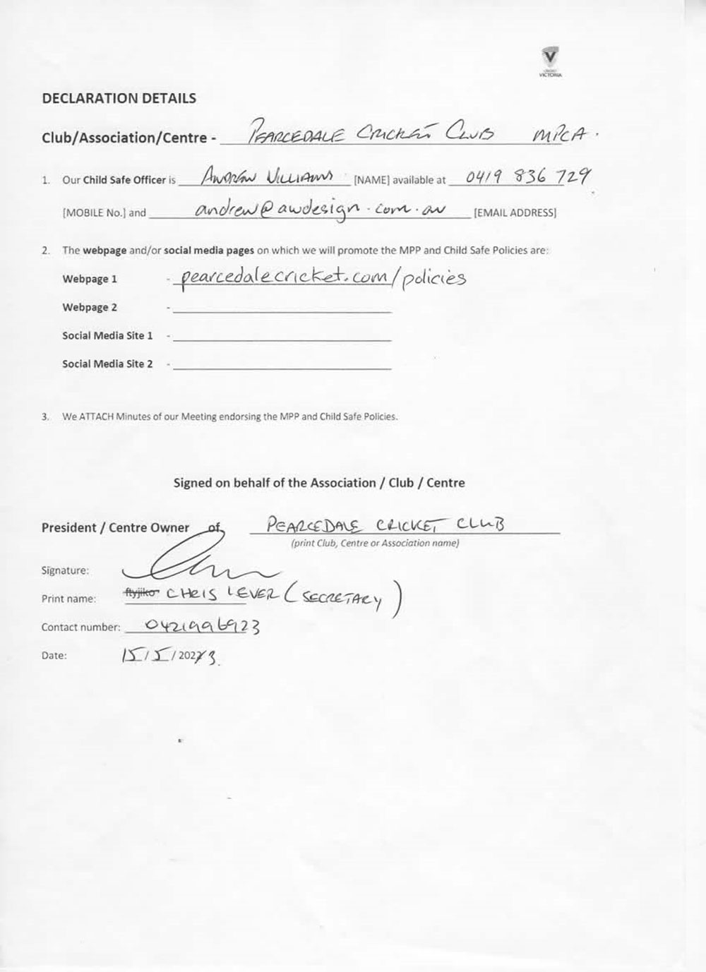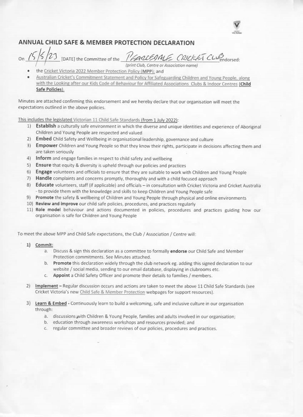 The Pearcedale Cricket Club has endorsed the Cricket Victoria 2022 Member Protection Policy and Australian Cricket’s Commitment Statement and Policy for Safeguarding Children and Young People, along with the Looking after our Kids Code of Behaviour for Affiliated Associations Clubs & Indoor Centres.